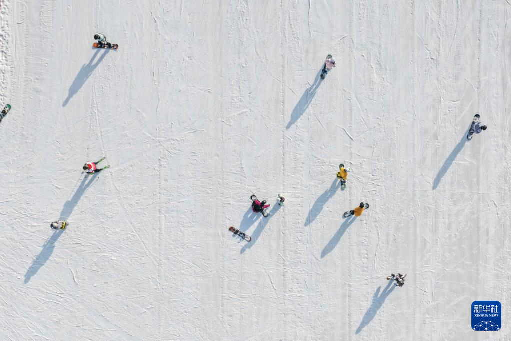 人們?cè)诤艉秃铺伛R鬃山滑雪場(chǎng)滑雪(2025年12月14日攝,無(wú)人機(jī)照片)。